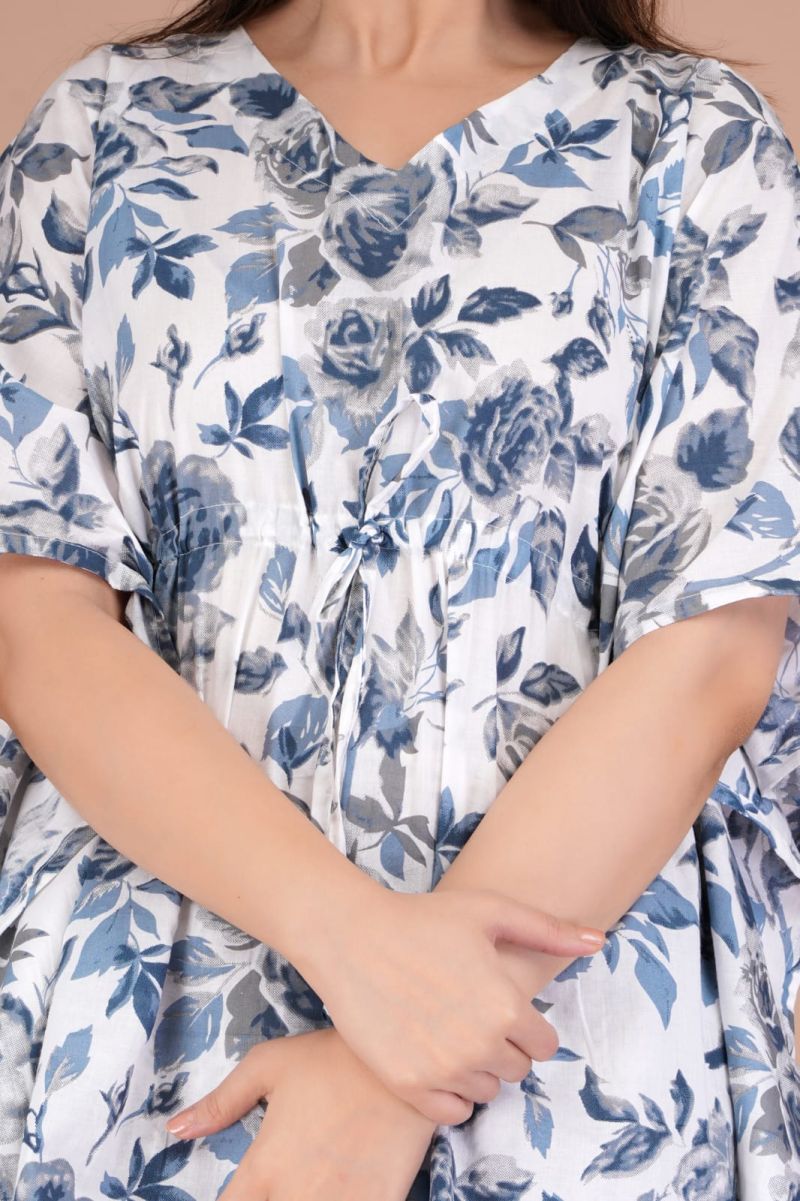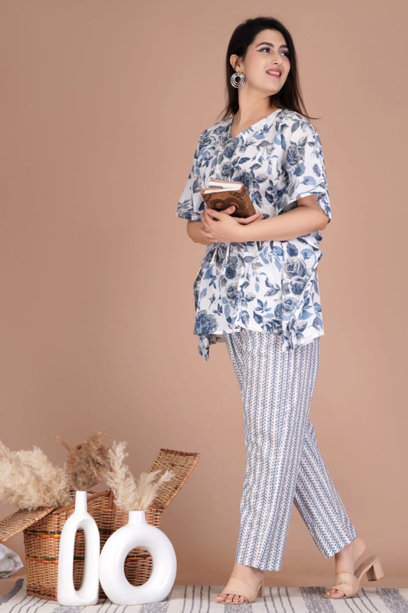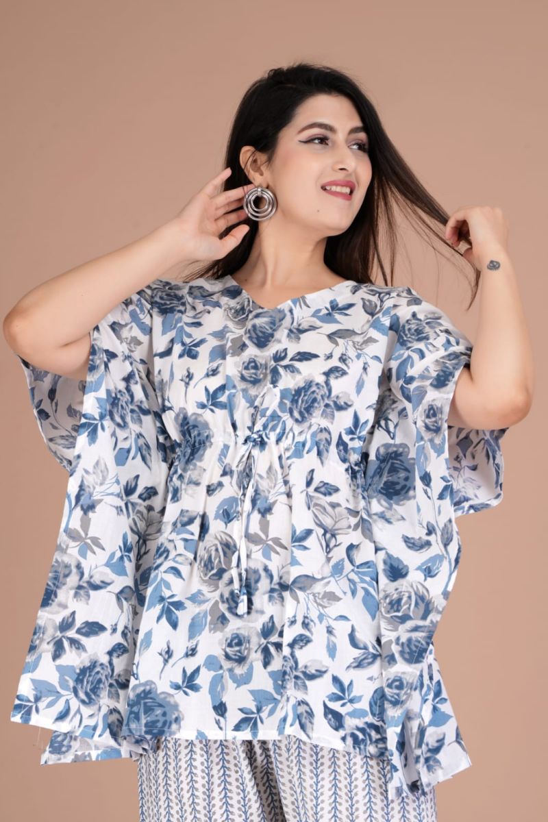 Elegant Light Blue Kaftan Co-ord Set. Features comfortable cotton fabric, stylish handblock prints, and fabric dori detailing. Perfect for casual chic looks