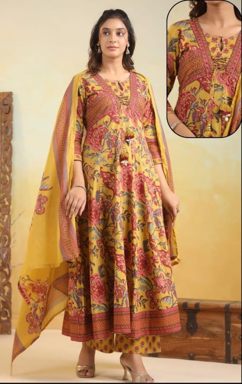 Elevate your ethnic style with our stunning Mustard Yellow & Maroon Pure Cotton Front Knot Anarkali Suit, paired with a beautiful dupatta. Handcrafted with manual & handwork, this suit is perfect for traditional occasions