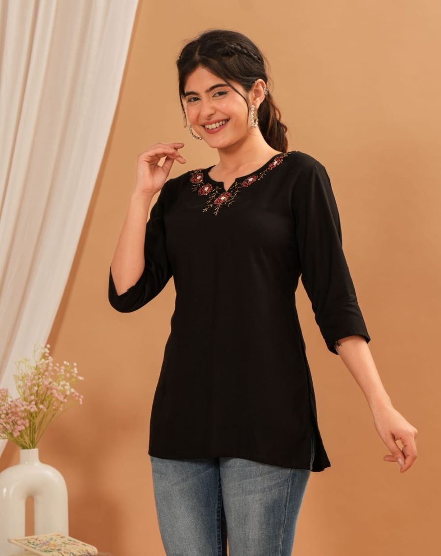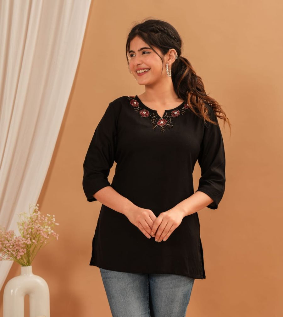 A rayon fabric short kurti is a stylish and comfortable choice for daily wear. Lightweight and breathable, rayon offers a soft texture that drapes beautifully, making it ideal for casual outings or office wear. These kurtis often feature trendy cuts, vibrant prints, and elegant designs, providing both comfort and style for everyday dressing